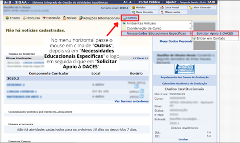 No menu horizontal passe o mouse em cima de “Outros”, depois vá em “Necessidades Educacionais Específicas” e logo em seguida clique em “Solicitar Apoio a DACES”.